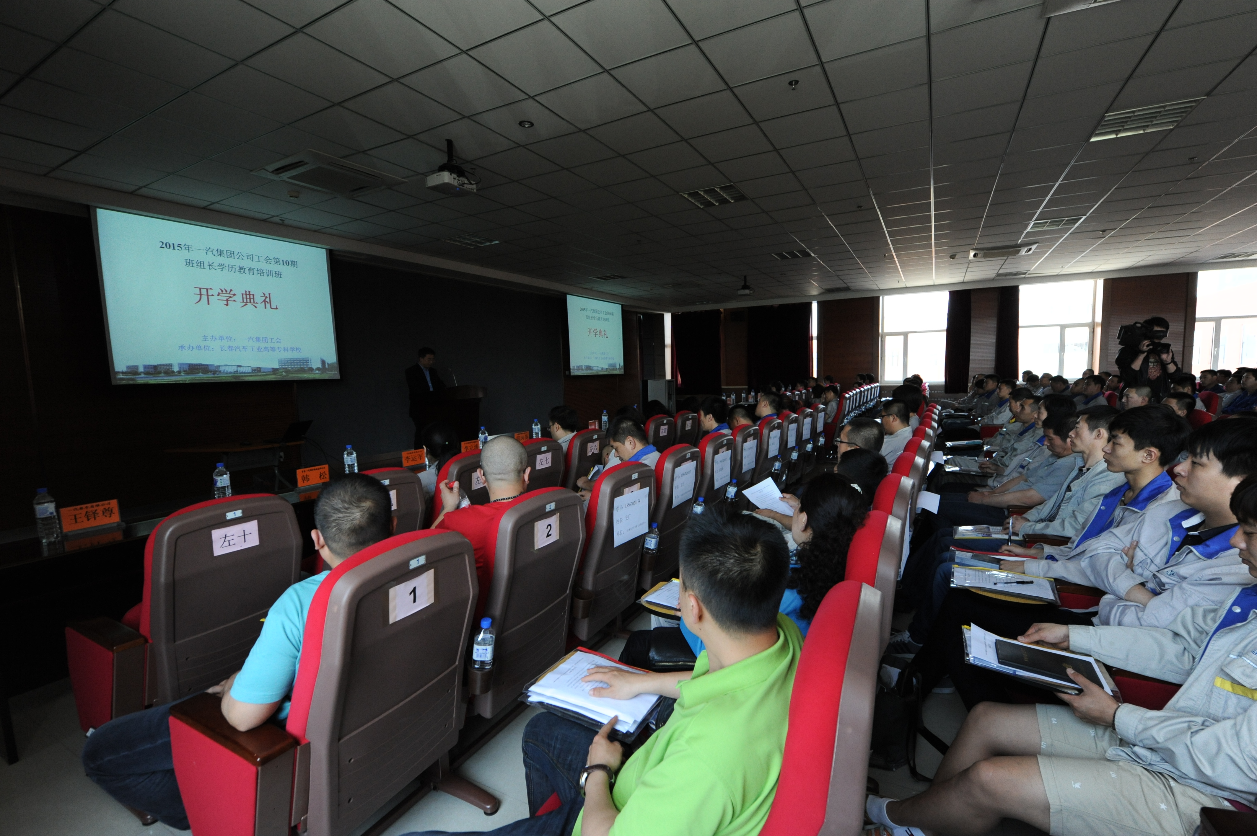 2015年5月22日,在学校培训楼401会议室召开了中国第一汽车集团工会第十期班组长学历教育培训班开学典礼,标志着一汽集团公司工会班组长培养新一轮高潮的到来,也是校企合作的进一步深化。