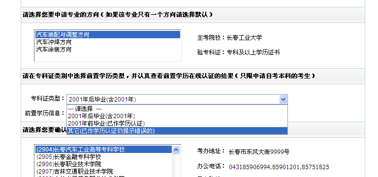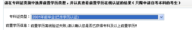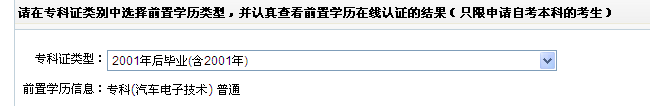 前置学历审核一项,在专科证类型方面请如实选择。选择后,在“前置学历信息”一栏中,会显示审核结果。